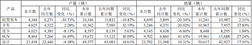 产量方面,公司2月整体产量为21458辆,较去年同期略有下降;本年累计产量为49377辆,同比增长14.61%。其中,SUV及卡车累计产量增幅分别达30.09%及32.19%。