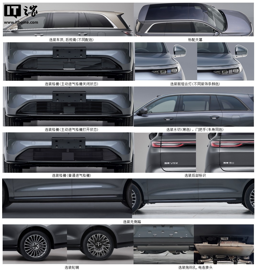 新车可选装后视镜、格栅、前组合灯、水切、门把手、后部标识、无侧踏、轮辋、拖钩孔、电连接头;允许外接充电;准拖挂车总质量 2000kg(带制动)。
