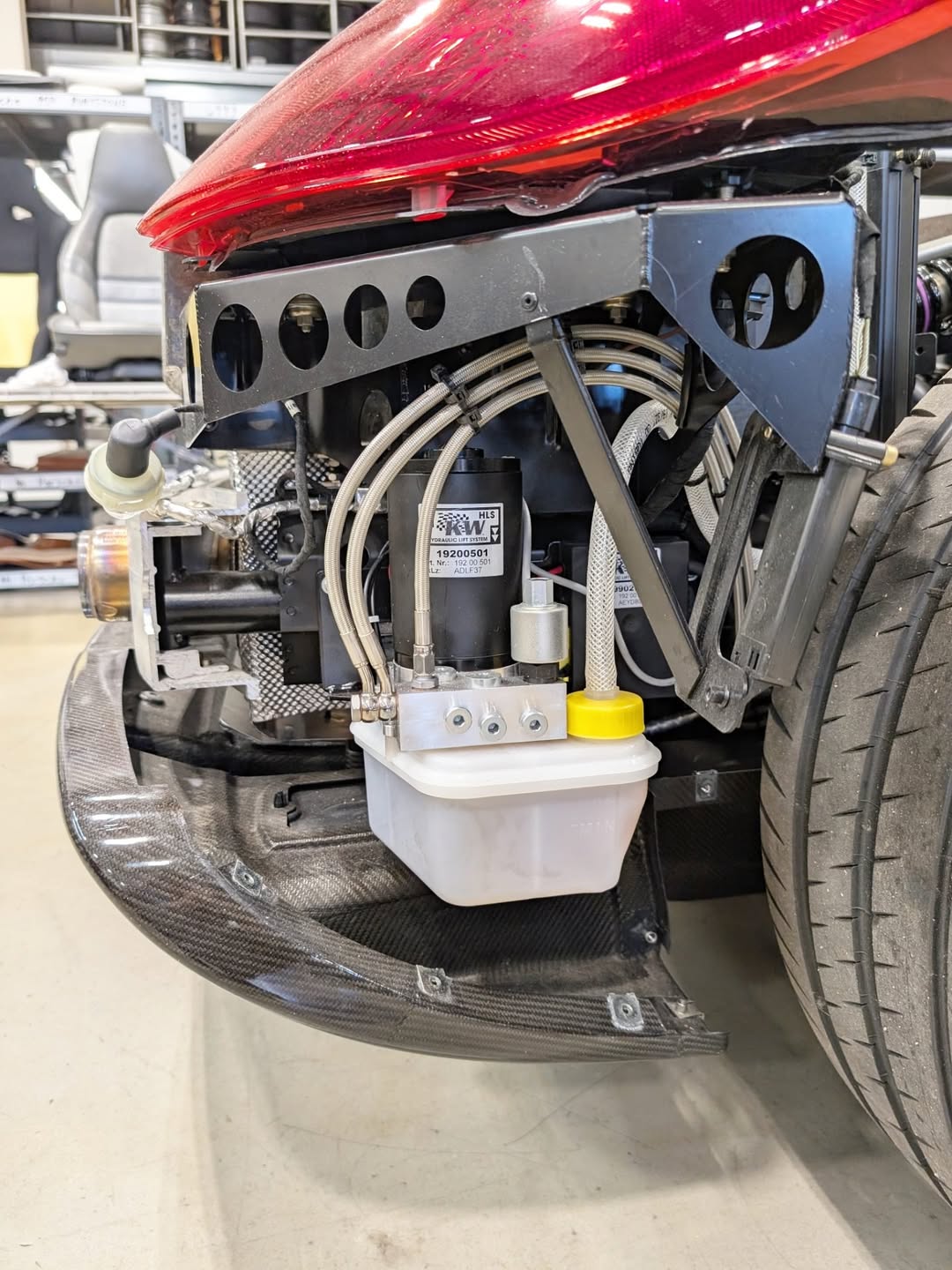 改装团队将原厂弹簧彻底替换为高性能的 KW 弹簧,并额外集成了一套液压升降系统,大幅增强了车辆通过复杂路况的实用性。