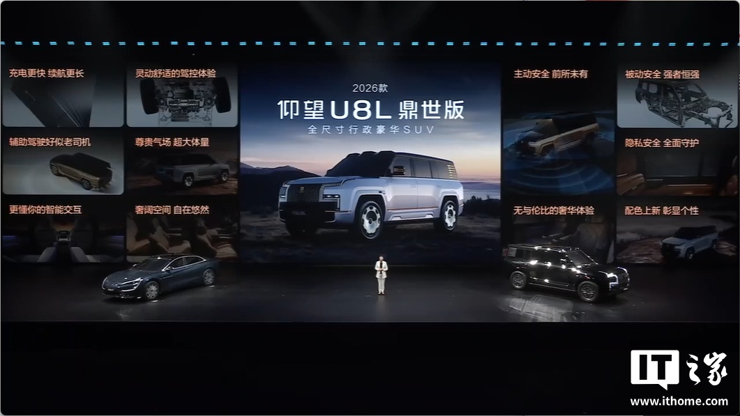 IT之家注意到,仰望 U8L 也迎来了 2026 款,同样增加续航,新增闪充,还提供三大安全升级:应急浮水紧急自动激活、NOA 爆胎稳行稳停、全场景隐私安全,老款车型后续也能通过 OTA 获得这些功能。
