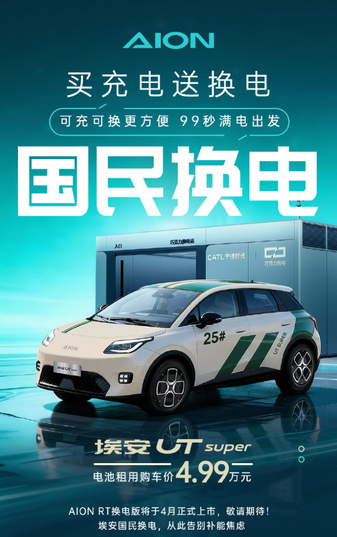 此前,广汽埃安与宁德时代、京东合作开发的埃安 UT super 已于 2025 年 11 月上市。这款车型定位 10 万级市场,采用可充可换的双补能模式,电池租用购车价 4.99 万元,整车购买价 8.99 万元。