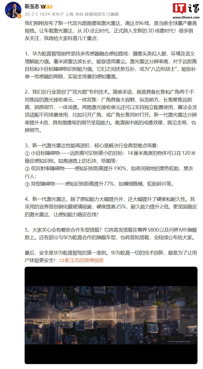 IT之家从靳玉志微博获悉,华为乾崑新一代双光路图像级激光雷达将首发搭载在尊界 S800 以及问界 M9 旗舰款上。还有部分与华为乾崑合作的旗舰车型,也将首批搭载,后续会陆续公布。