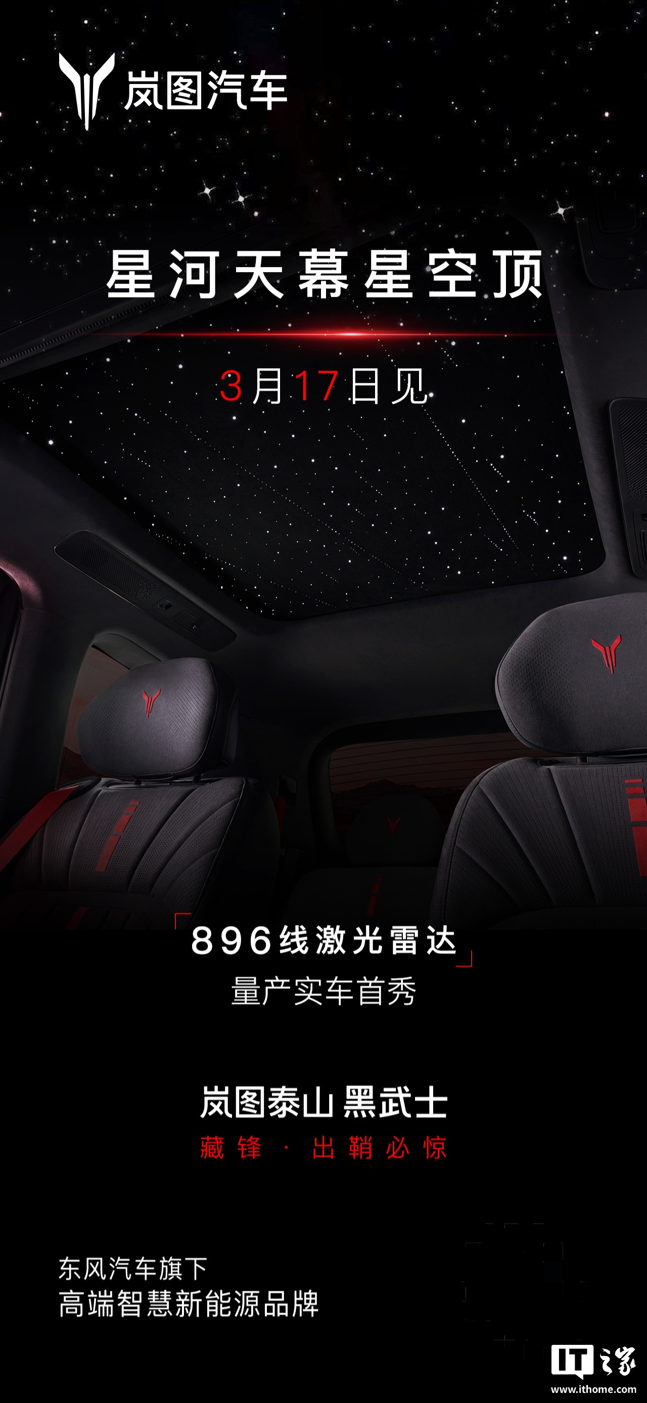 IT之家 3 月 6 日消息,岚图泰山技术焕新发布会 ——《远见》定档 3 月 17 日举行,首款量产华为 896 线旗舰 SUV —— 岚图泰山将迎来实车首秀。