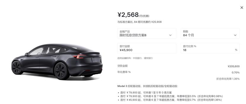 以特斯拉Model 3后轮驱动版为例,其官方指导价25.95万元,按照特斯拉7年低息方案,首付18%,贷款金额20.56万元,年化利率0.7%,采用等额本息还款方式,7年84期的月供约为2568元,总利息支出约为10032元。