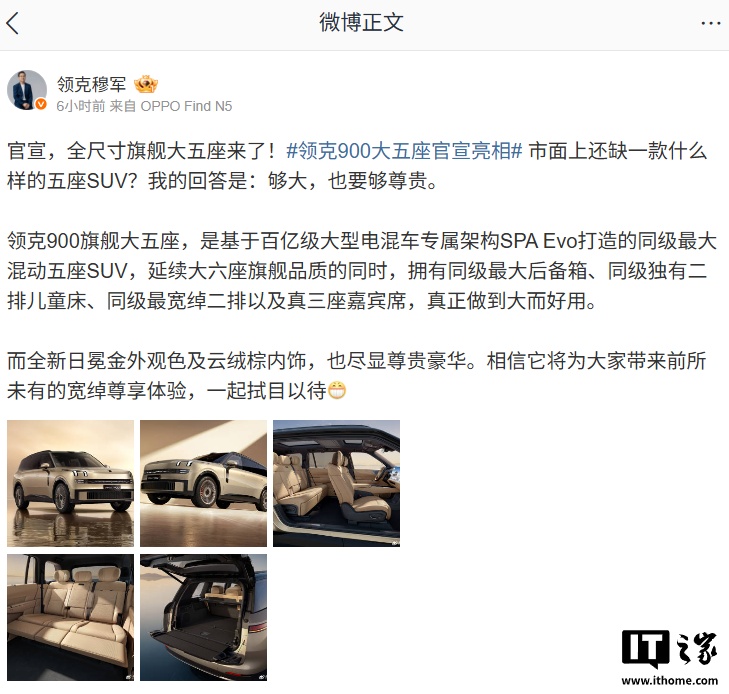 IT之家 3 月 6 日消息,今日,领克 900 全尺寸旗舰大五座 SUV 官宣亮相,带来全新“日冕金”车色。随后,领克汽车销售有限公司副总经理穆军公布这款新车的座舱官图。