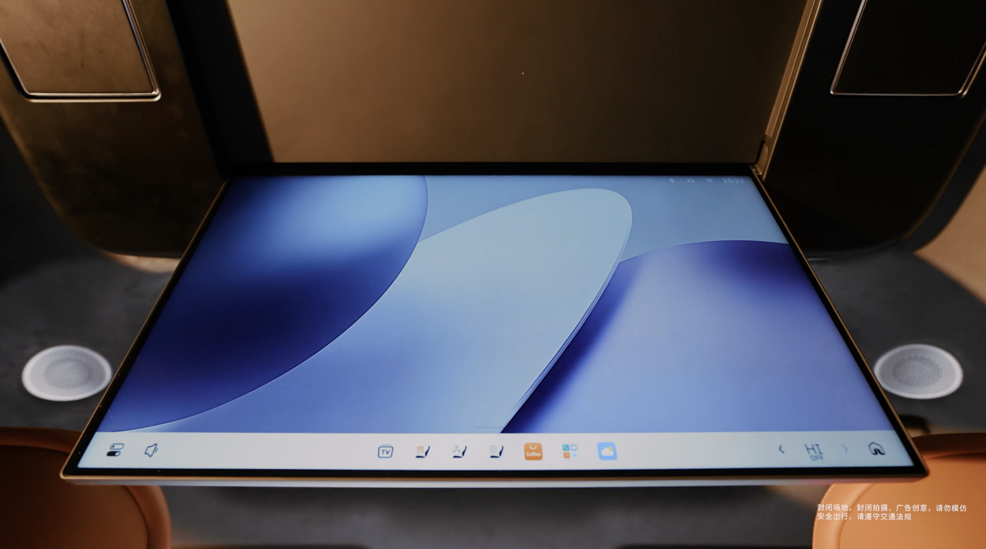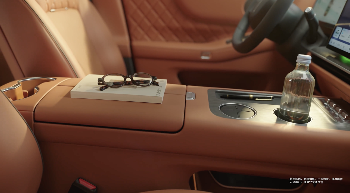 参考官方海报,该车采用 2+2+2 式 6 座布局,内饰使用橙红色 / 灰色的双拼配色设计,前排提供双辐方向盘、悬浮液晶仪表、大尺寸双联屏、怀挡式换挡设计。二排空间带有吸顶娱乐屏、带腿托的零重力座椅,门边的把手位置留有手机无线充电区域。