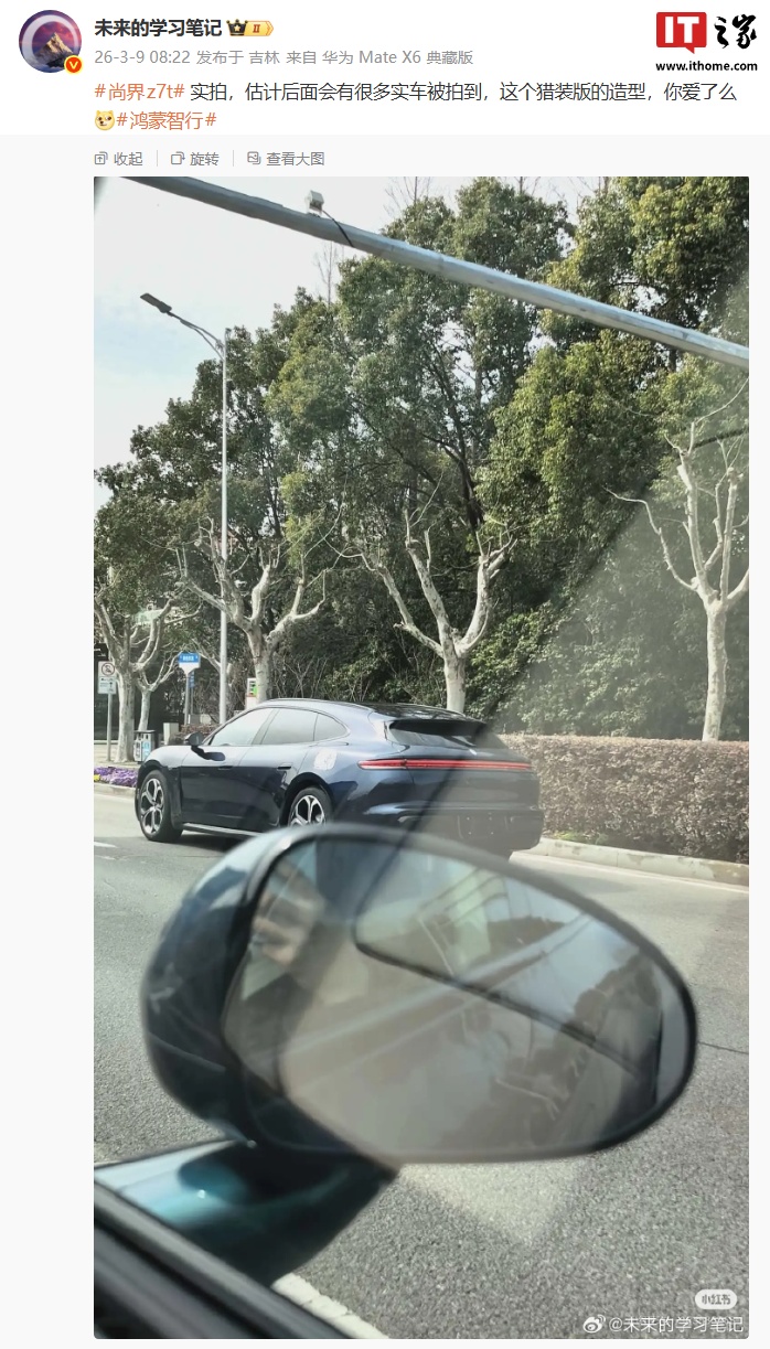 IT之家 3 月 9 日消息,据博主 @未来的学习笔记 今日分享,鸿蒙智行尚界 Z7T 无伪装实车已上路。新车采用猎装造型设计,更多信息本月底揭晓。