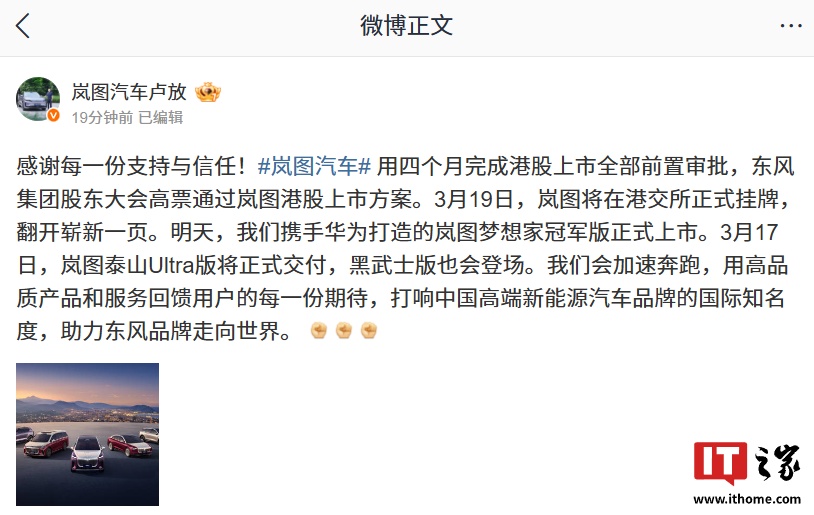 IT之家 3 月 9 日消息,岚图汽车科技股份有限公司董事长、党委书记卢放今日发文宣布,岚图汽车用四个月完成港股上市全部前置审批,东风集团股东大会高票通过岚图港股上市方案。3 月 19 日,岚图将在港交所正式挂牌。