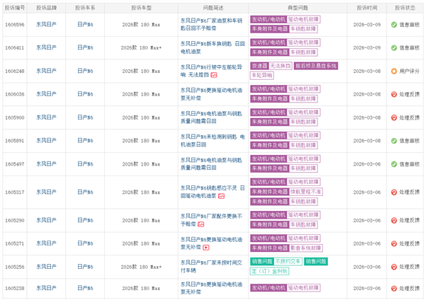 快科技3月10日消息,汽车第三方投诉平台车质网显示,东风日产N6近期遭到车主集体投诉,投诉原因普遍为“厂家油泵和车钥匙召回,不给予车主赔偿”。
