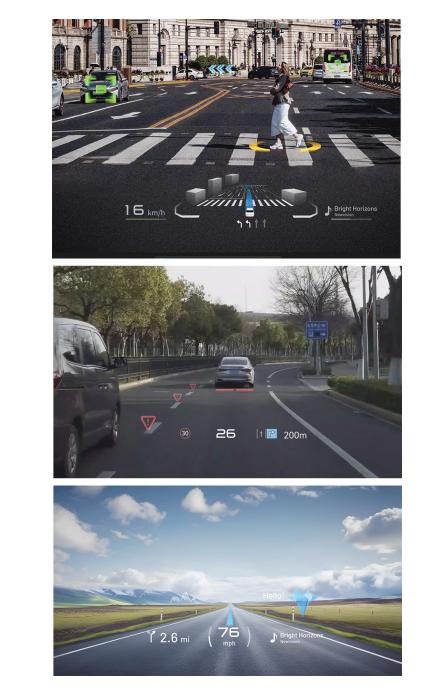 原理是通过复杂的AR算法和光学成像,将虚拟信息(如导航箭头、车辆识别)如同贴合在真实道路上一样进行显示,提供沉浸式、直观的增强现实体验,例如实现AR导航、动态追踪物体等。