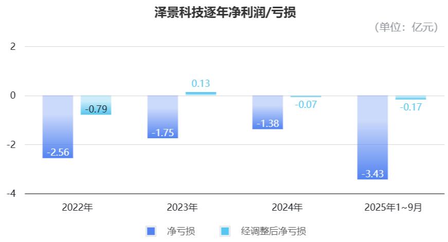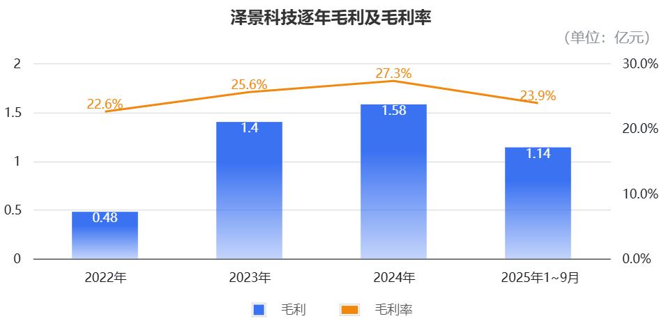 2025年前九个月,泽景科技毛利为1.14亿元,毛利率则回落到23.9%。