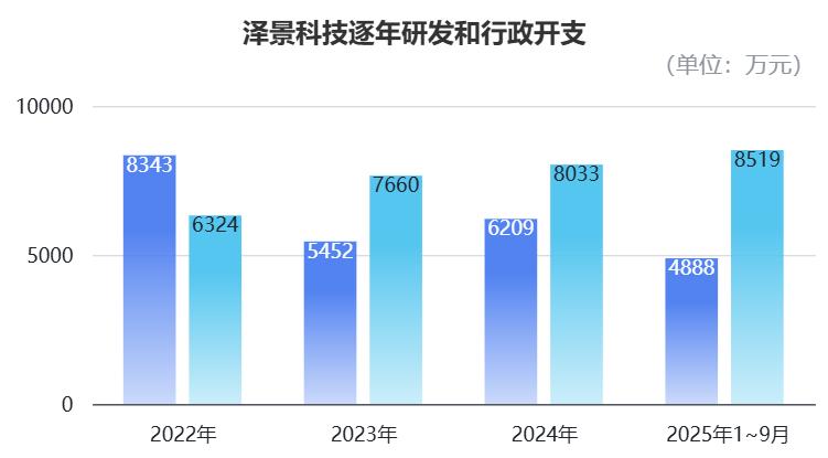 2022年到2024年以及2025年前几个月,泽景科技的研发开支分别为8343万元、5452万元、6209万元和4888万元。