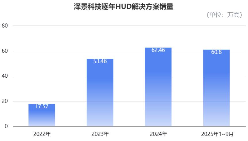 2022年、2023年、2024年以及2025年前九个月,泽景科技的HUD解决方案销量,分别为17.57万套、53.46万套、62.46万套,以及60.80万套。