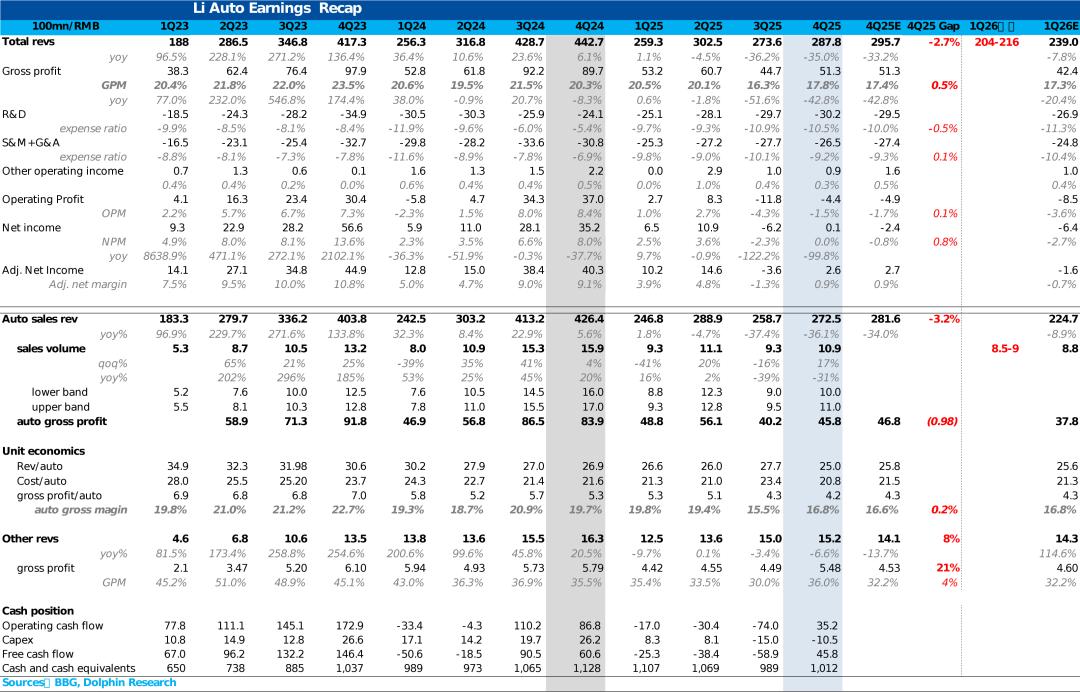 基于上述大幅下行的均价预期,以及一季度仍然相对疲软的销量(Q1销量环比25Q4下滑17%-22%,导致单车分摊的固定成本上升,规模效应减弱),再叠加近期上游锂电、存储芯片等大宗原材料涨价对BOM成本的反噬,海豚君预计理想一季度的车辆毛利率预计还要环比继续走低,低于市场预期的16.8%(25Q4水平),而具体指引仍需密切关注管理层在业绩会上的表述。