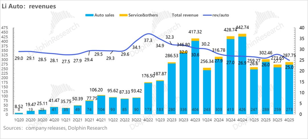 在销量已经公布的情况下,四季度理想总收入是288亿, 略低于市场预期的296亿,收入端再次录得同比-35%的负增长。