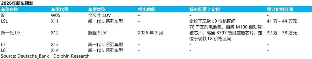 ① 自研算力底座即将落地: 采用 5nm 制程的自研“马赫 100(M100)”芯片即将量产落地,其单车双芯配置的有效算力高达 2560 TOPS 。该芯片将首搭于新一代旗舰 L9 Livis 车型 ,并计划在 2026 年推动 VLA 大模型的全系标配。