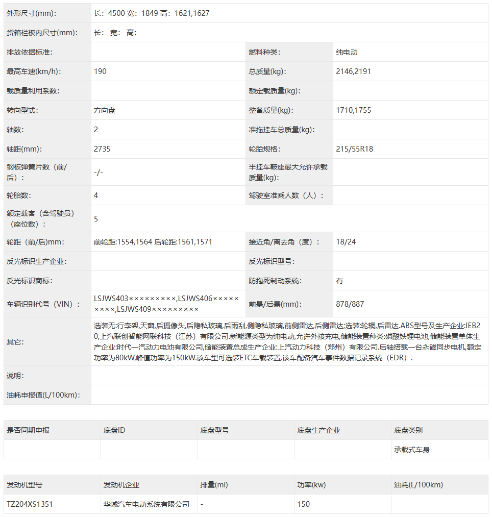 申报信息显示,这款新车长宽高为 4500mm*1849mm*1621(1627)mm,轴距为 2735mm。后轴搭载一台永磁同步电机,额定功率为 80kW,峰值功率为 150kW。