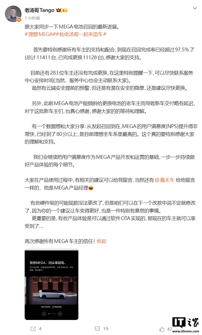 IT之家 3 月 15 日消息,今日,理想汽车产品线负责人汤靖公布 MEGA 电池召回的最新进展。到现在召回完成率已经超过 97.5%(总计 11411 台,已完成更换 11128 台),目前还有 283 位车主还没有完成更换。“虽然有云端安全提前的预警,但还是有潜在安全的隐患,还是建议尽快更换。”汤靖表示。