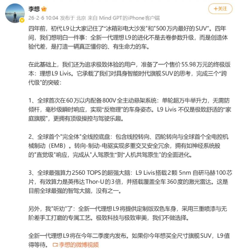 2026年2月,理想汽车CEO李想通过微博官宣:全新一代理想L9 Livis版将搭载两颗自研“马赫100”芯片,总算力达2560TOPS,相当于3倍英伟达Thor-U的有效算力,堪称全球最强智驾大脑。