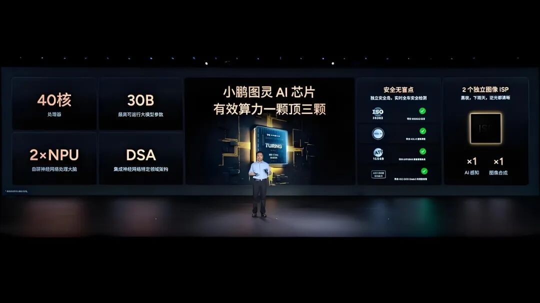 2024年,小鹏正式发布图灵AI芯片,采用40核设计、DSA架构,专为端到端大模型优化,单颗算力达750TOPS,等效3颗Orin-X,算力利用率实现100%,支持30B参数大模型运行,1颗即可实现L3+智驾体验,2颗就能达成L4级自动驾驶支撑城市NOA全覆盖。