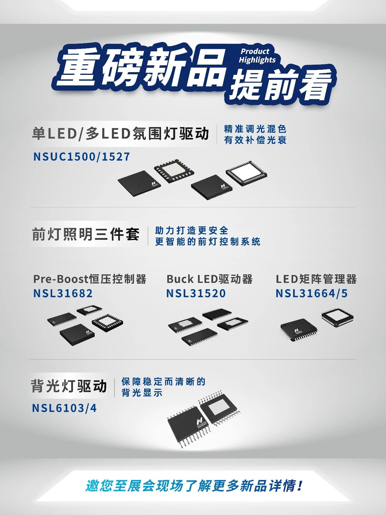 本次展会,纳芯微将重点展示面向汽车内外饰照明的LED驱动解决方案,覆盖内饰氛围灯、阅读灯、背光灯、前灯、尾灯、ISD交互灯、格栅灯及充电门氛围灯等应用场景。