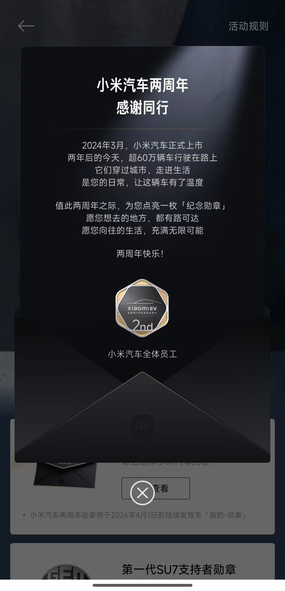 另外,小米汽车还为车主点亮了一枚「纪念勋章」,庆祝小米汽车上市 2 周年。