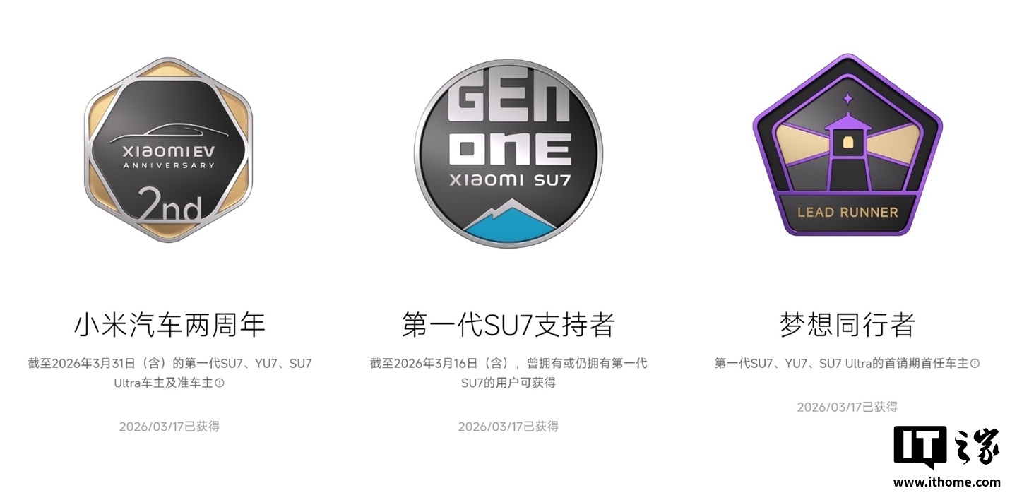 IT之家 3 月 18 日消息,小米 SU7 初代车型将于本月底迎来发布两周年,目前小米汽车 App 已悄悄为老车主推出专属纪念,向符合条件的用户发放三枚虚拟勋章,小米汽车现车主与历史车主均可按条件获取,不设置账号绑定与车辆过户限制。