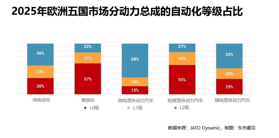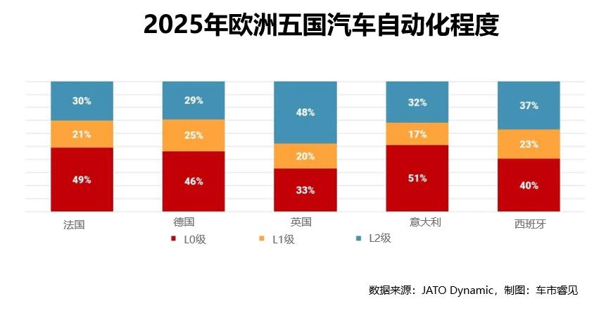 在欧洲五大市场内部,各国对自动驾驶技术的接纳程度存在明显差异。英国表现突出,其搭载L2级系统的车辆占比达48%,在受调查国家中居首,反映出当地市场对创新与安全配置的较高偏好。相比之下,意大利和法国市场中无自动化功能的车辆比例更高,或与价格敏感度及车型结构等因素有关。
