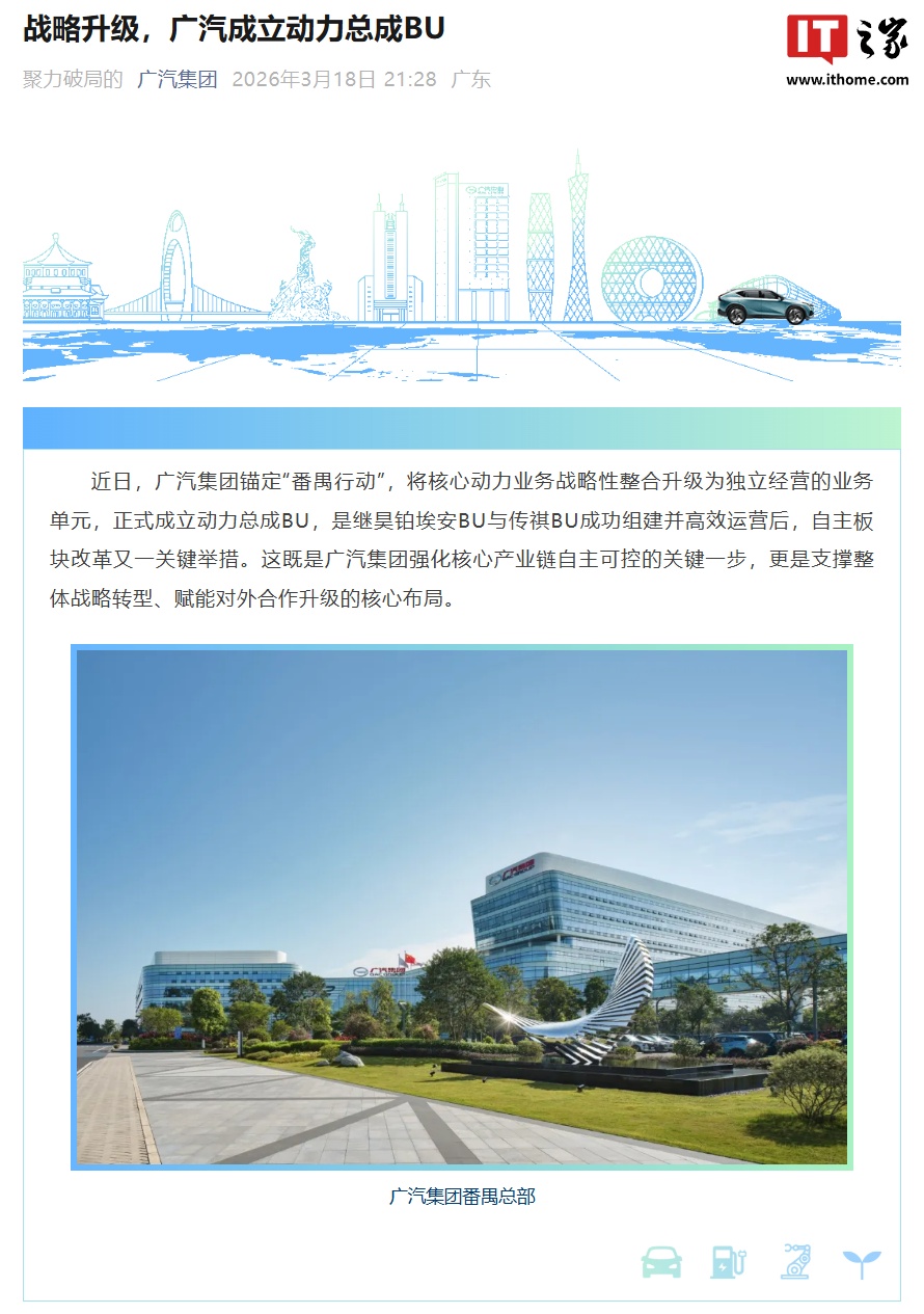 IT之家 3 月 18 日消息,广汽集团官方今日宣布,其锚定“番禺行动”,将核心动力业务战略性整合升级为独立经营的业务单元,通过聚合此前分散的研发、生产、供应、销售等核心环节,正式成立动力总成 BU。广汽表示,这是继昊铂埃安 BU 与传祺 BU 成功组建并运营后,自主板块改革又一关键举措。