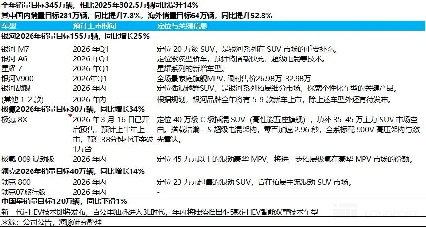 而从各品牌规划来看,吉利将在 2026 款推出近 10 款新车,推动销量目标的完成: