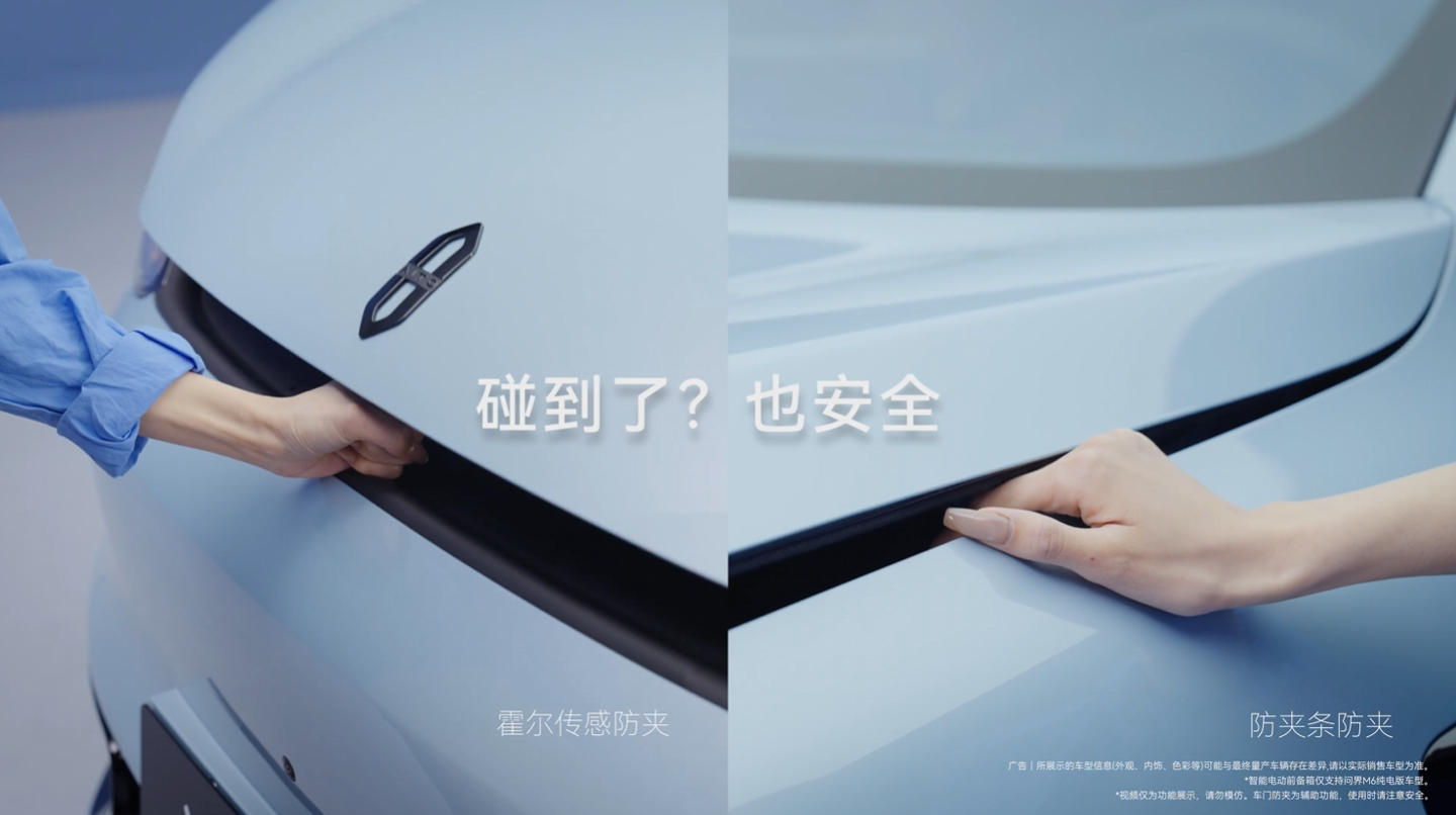 据介绍,问界 M6 搭载智能电动前备箱,拥有至高 202L 的容量,支持双击(敲一敲)、隔空手势、车外语音等方式开启。前备箱还采用多重防夹设计,支持正向霍尔传感防夹、侧向防夹条防夹。
