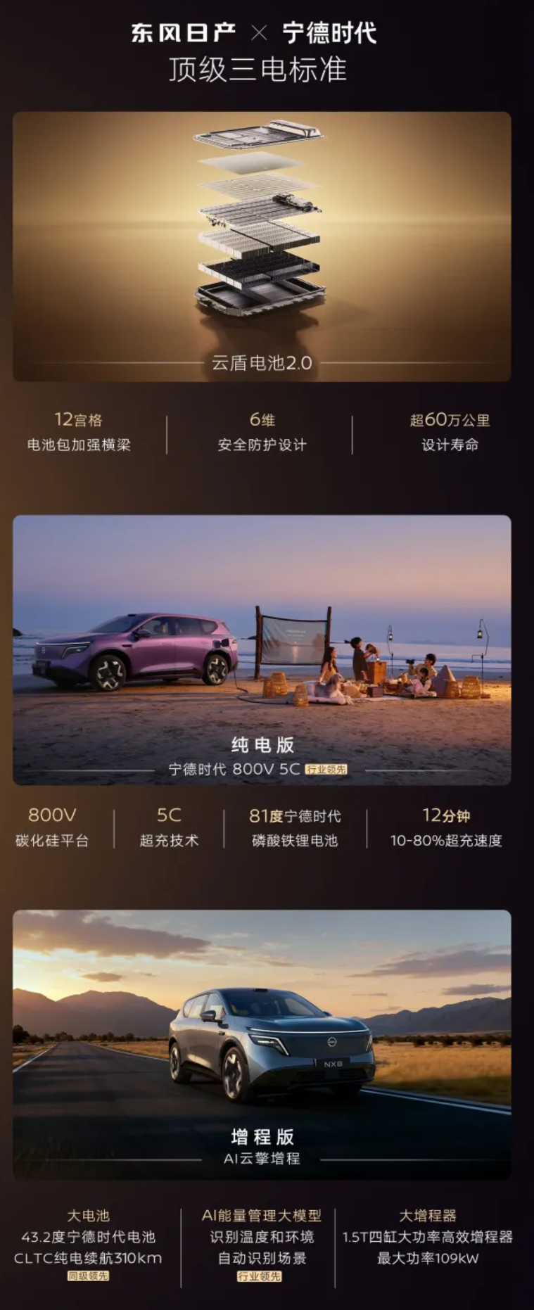 规格方面,该车拥有云盾电池 2.0,设计寿命超 60 万公里,增程版搭载 1.5T 涡轮增压发动机(IT之家注:最大功率 109 千瓦)与电机(最大功率 195 千瓦),前者最大功率 109kW;纯电版提供 215 千瓦和 250 千瓦两种单电机选项,拥有 800V 碳化硅平台,支持 5C 超充技术。