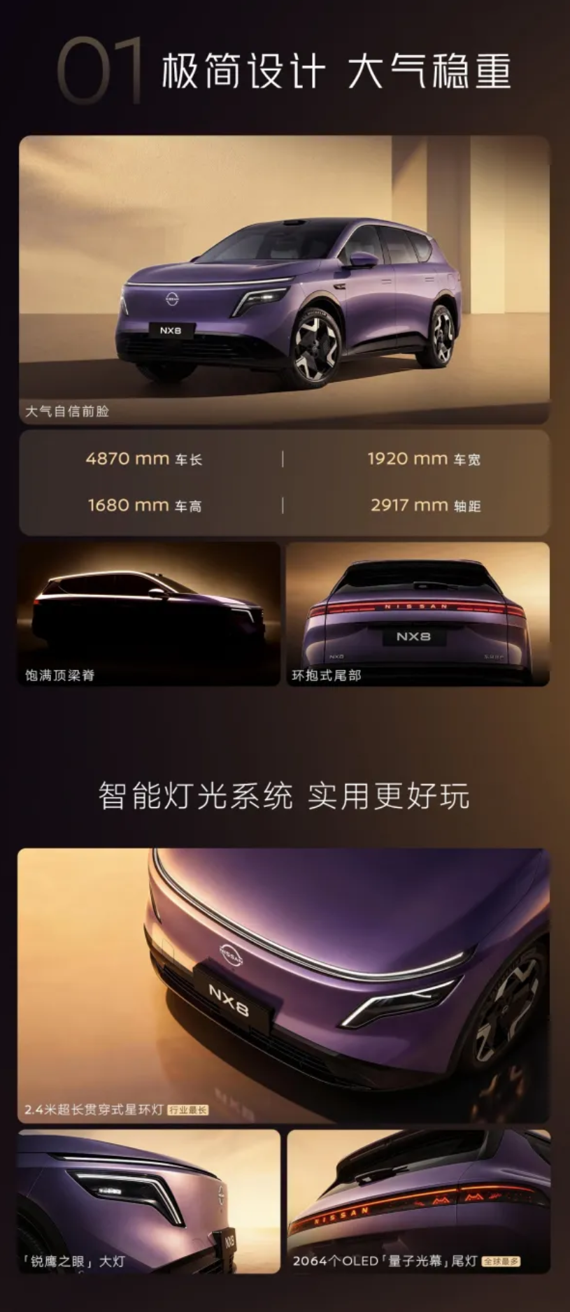 IT之家了解到,这款汽车将提供纯电与增程两种动力版本,均采用 800V 碳化硅平台,并搭载宁德时代磷酸铁锂电池,支持 5C 超快充技术,长宽高分别为 4870*1920*1680mm,轴距 2917mm,前脸搭载行业最长 2.4 米超长贯穿式星环灯,后尾则带有 2064 个 OLED 量子光幕尾灯。