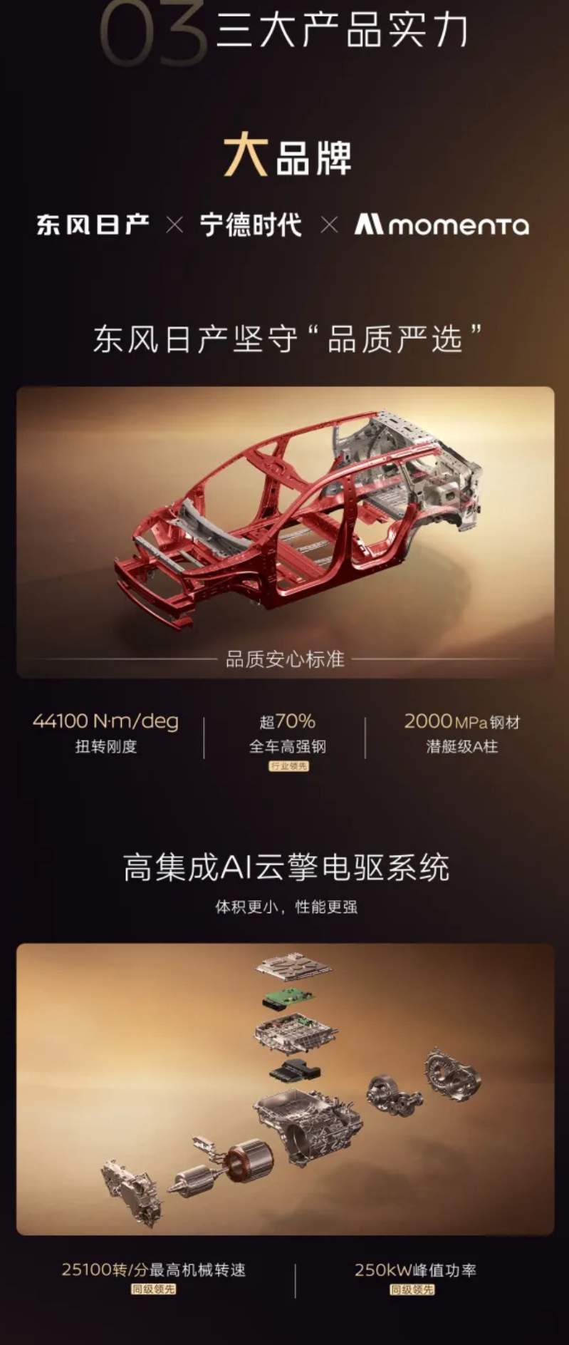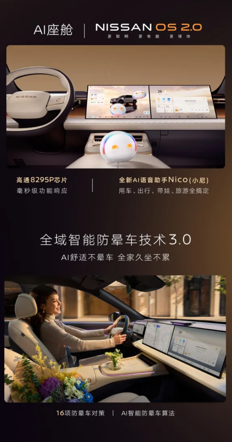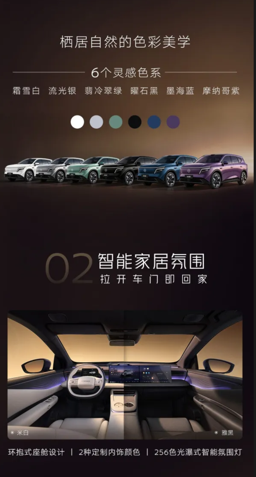 外观方面,该车提供霜雪白、流光银、翡冷翠绿、曜石黑、墨海蓝和摩纳哥紫六种配色,由东风日产、宁德时代、momenta 联合打造,A 柱配备 2000MPa 钢材,全车超 70% 装备高强钢。