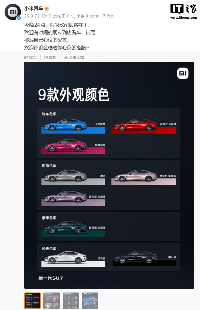 IT之家 3 月 22 日消息,小米汽车官方今日宣布,新一代 SU7 限时改配将于今晚 24 点截止。根据官方介绍,新一代 SU7 在锁单后可限时改配,且交付周期不变。