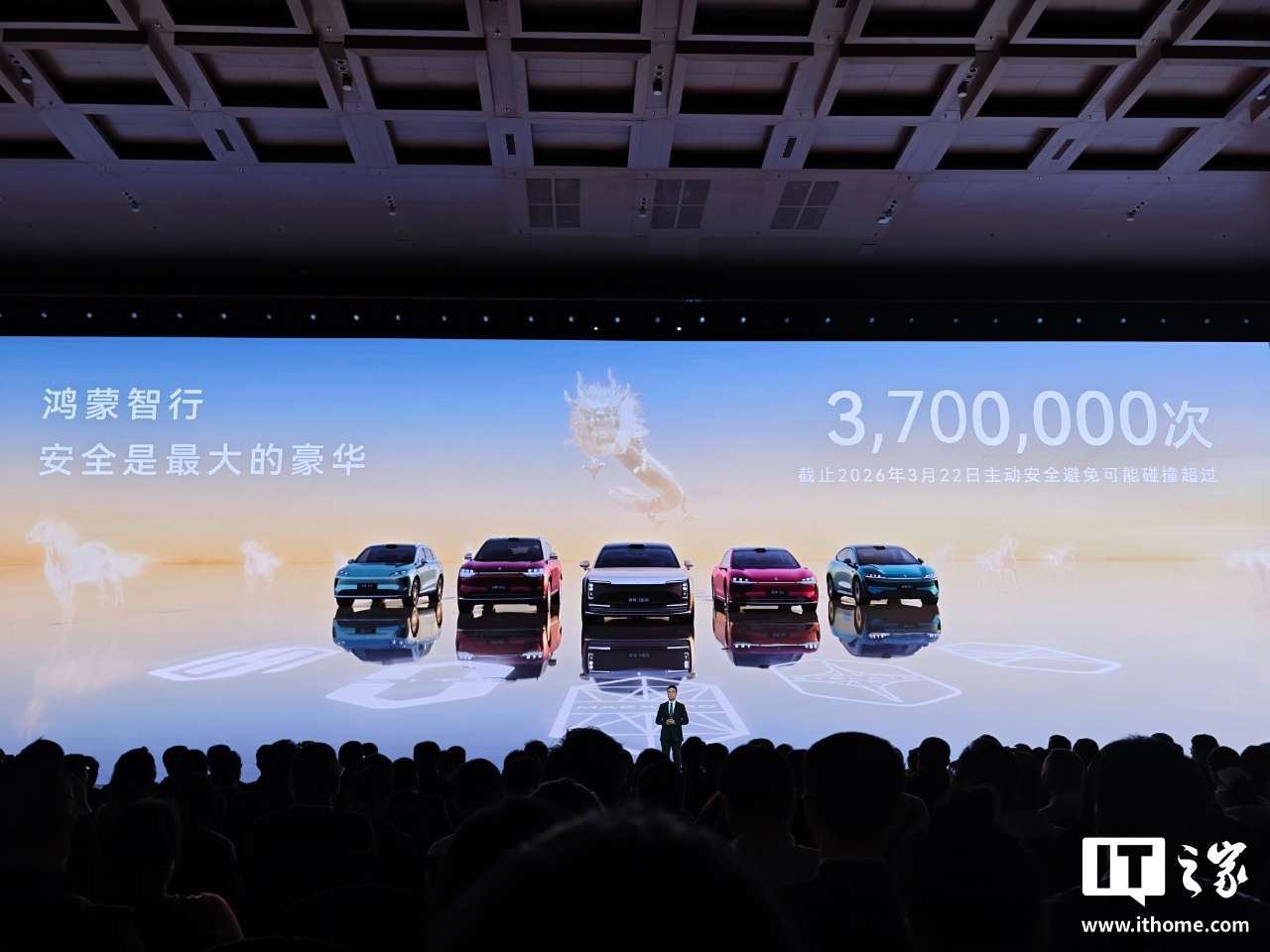 此外,鸿蒙智行创造新势力品牌交付百万辆最快纪录(43 个月),还连续 14 个月位居中国汽车品牌成交均价第一。截至 2026 年 3 月 22 日,鸿蒙智行旗下车型主动安全避免可能的碰撞超 370 万次。