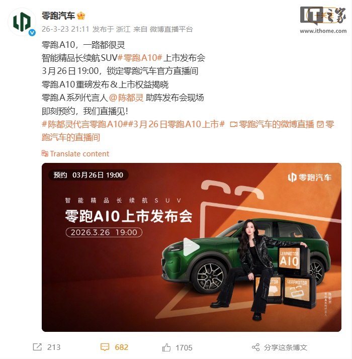 IT之家 3 月 23 日消息,据零跑汽车官微消息,旗下全新小型 SUV 零跑 A10 上市发布会定档 3 月 26 日 19:00,届时将揭晓新车的上市权益,零跑 A 系列代言人陈都灵也将助阵发布会现场。