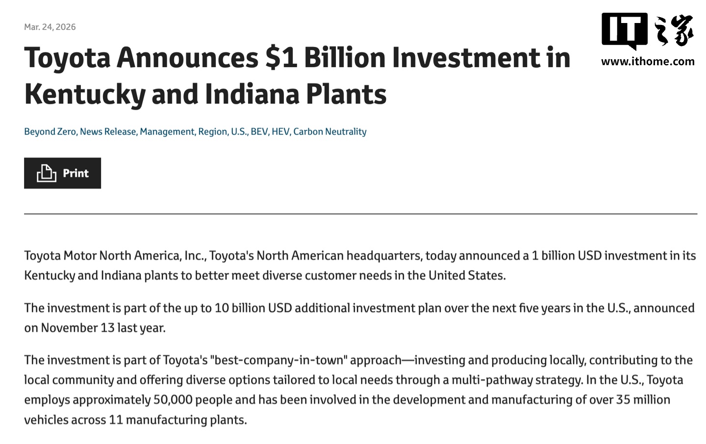 IT之家 3 月 24 日消息,丰田汽车宣布,将向美国两座工厂追加总计 10 亿美元(IT之家注:现汇率约合 68.96 亿元人民币)投资,作为其未来五年在美最高 100 亿美元(现汇率约合 689.65 亿元人民币)投资计划的一部分。