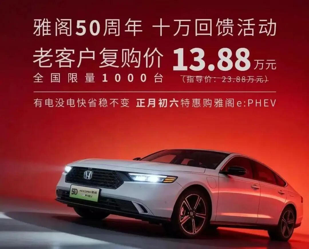 2026年春节尾声,广汽本田宣布一项优惠政策:在雅阁50周年之际,推出雅阁e:PHEV 13.88万元的老客户复购价,限量1000辆。此前,该车官方指导价为23.88万元,此次优惠,相当于直降10万元。