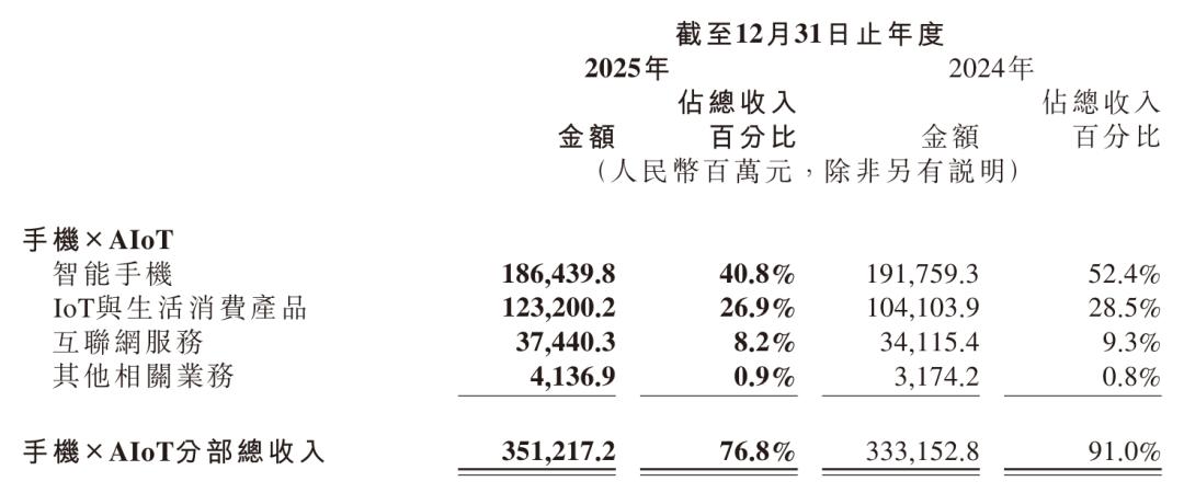 小米集团2025年手机×AIoT分部收入3512亿元,较上年同期的3331.5亿元增长5.4%,占营收的比例为76.8%。