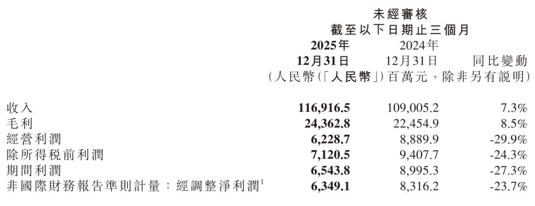 小米集团2025年第四季度营收1169亿,较上年同期的1090亿元增7.3%;运营利润62.29亿,期内利润为65.44亿元,经调整净利为63.49亿元。