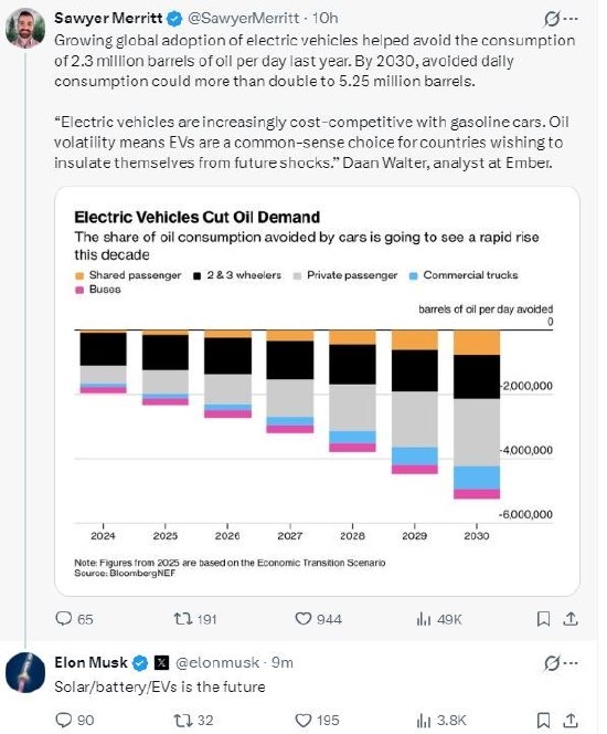 该观点认为,石油领域频繁波动的地缘政治风险,正在成为加速全球弃油转电的催化剂。特斯拉首席执行官马斯克对此深表认同,并简洁地回应称,这确实是正在发生的事实。