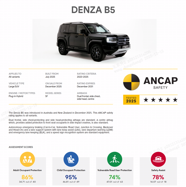据悉,该测试结果是汽车安全评估机构——澳洲新车安全评鉴协会(ANCAP)正式公布的车型安全评级,方程豹豹5获得了五星安全评级。