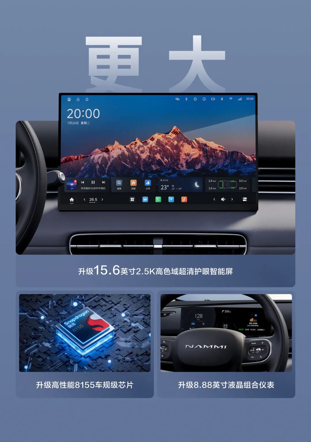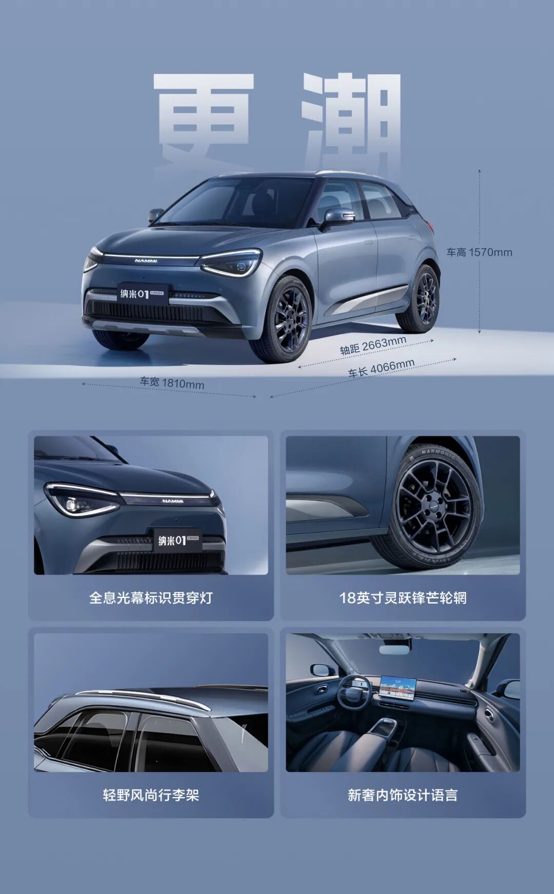 新车带来全新的“苍山灰”配色,并拥有号称“同级唯一”的无框车门,车头配备全新全息光幕贯穿灯,大灯区域一体化设计,并新增可点亮 NAMMI 标识。据IT之家了解,新车长宽高分别为 4066/1810/1570mm,轴距 2663mm。