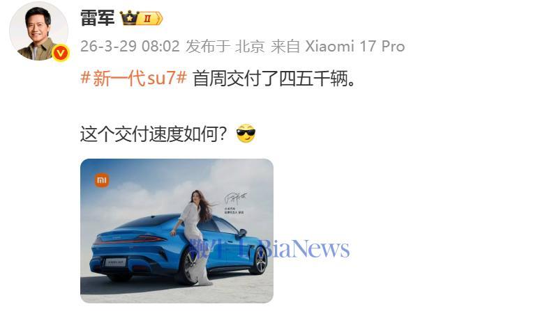 3月29日,雷军发文透露,新一代SU7首周交付了四五千辆。
