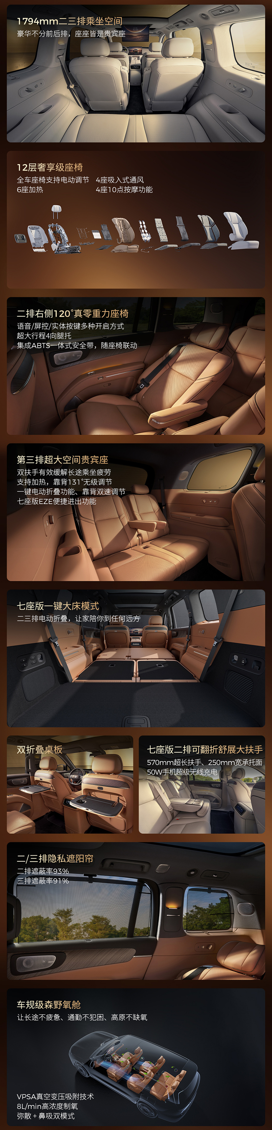 车辆二排将配备零重力座椅、双折叠桌板、头顶娱乐屏、冰箱以及功能控制屏。此外,新车还设置了 B 柱拉手,方便儿童、老人下车。三排配备了双扶手、一键电动折叠、座椅加热功能。