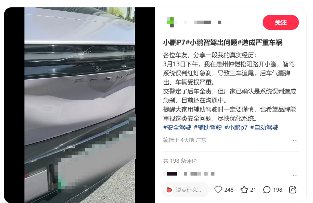 3月30日,近日,有小鹏车主在社交平台发文称,自己驾驶的小鹏汽车因智驾误判红灯急刹,导致三车追尾。