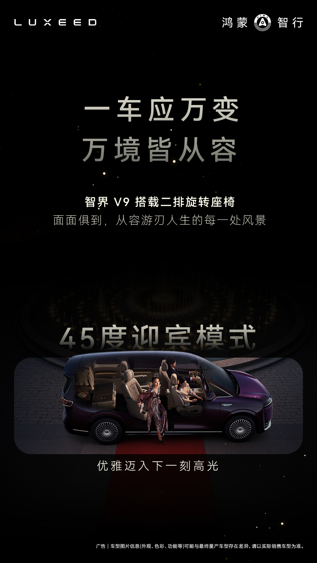 座椅功能方面,智界 V9 配备二排旋转座椅,支持大床模式、灵活行李舱、90 度观景模式、180 度对坐模式及 45 度迎宾模式等多种形态切换,兼顾商务接待与家庭出行需求。