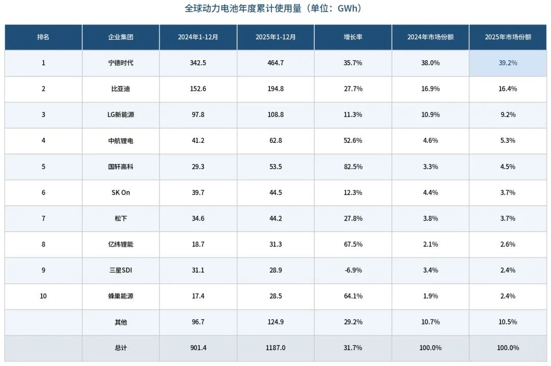其中,宁德时代2025年全球动力电池使用量市占率提升至39.2%,连续8年稳居全球第一。