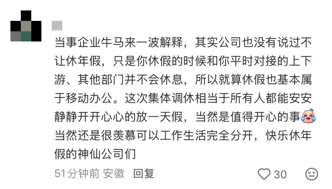 但与此同时,有员工表示,此前哪怕休假也免不了需要工作,此次调休可以让大家都安安心心的休息,是一件开心的事。